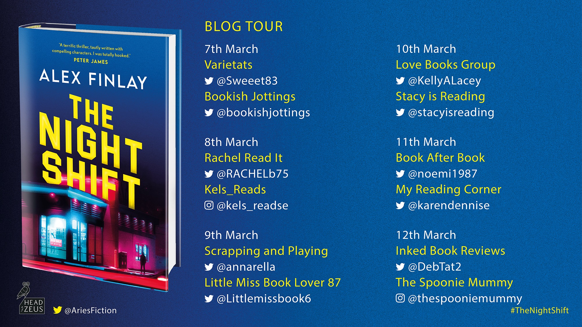 Good morning, everyone! Today, it’s my turn on the blog tour for The Night Shift, the gripping new novel by Alex Finlay.